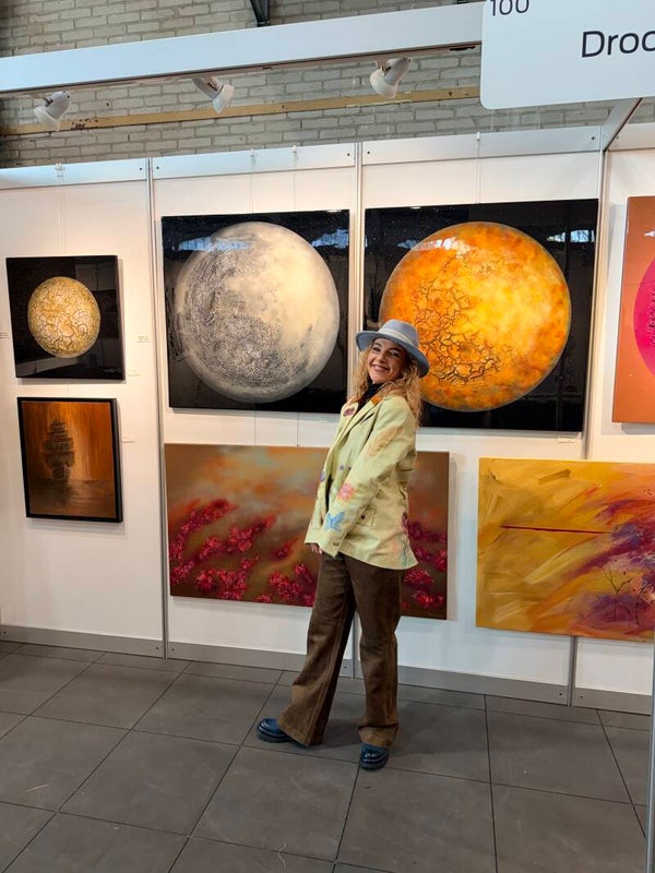 Met haar mysterieuze verschijning, haar warme kleuren, elegantie, diepten en helderheid is zij één van de pronkstukken van de collectie op dit moment. De Maan op haar mooist