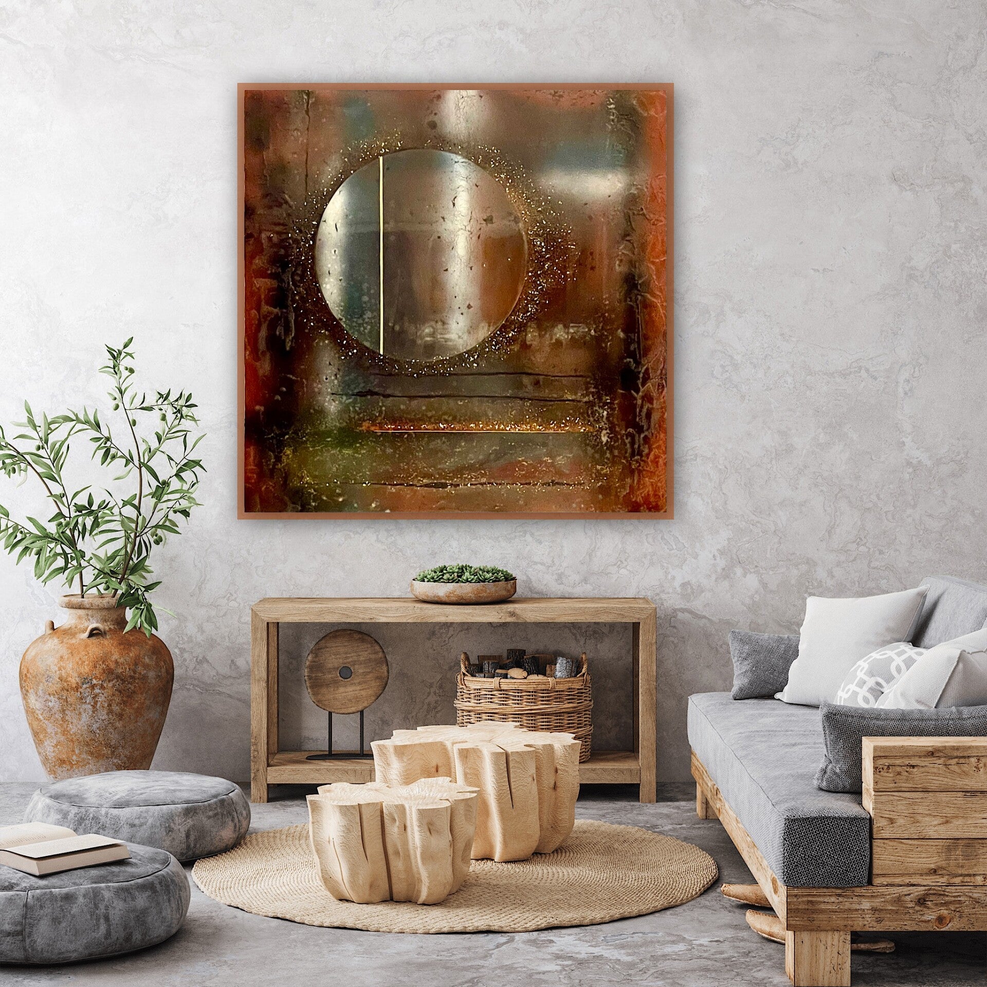 Koper, roestbruin, reliëf en details. Dit Kunstwerk staat voor bevrijding en doorzettingsvermogen. Er is ontzettend veel te zien in dit schilderij, en de cirkel in 3d zorgt voor een prachtig spiegelend, ruimtelijk effect. Insluitsels van bladgoud